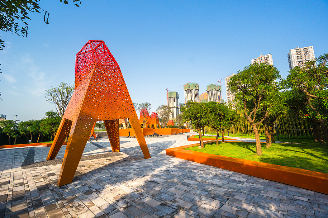 Martha Schwartz Partners (MSP) was commissioned in 2014 to design a public space that would serve as an entrance to a feature housing development in Fengming Mountain area in Shapingba District, Chongqing. Eventually, the proposal turned into a 16,000-sqm park that would structure future building and landscape development in the area, organizing mobility, providing universal accessibility and creating an iconic way-finding strategy for visitors. The vision was inspired by the unique landscapes, climate and culture of Chongqing; Mist and Rain; Mountains and Valleys; Rivers and Terraces. Pavilions designed to reflect the mystical mountains of the region are located within the arrival plaza, and are strategically positioned along the path, leading pedestrians down the ‘mountain’ into the Sales Centre area. The pavilions are also important to provide shade and relief along the journey. The site is extremely steep, using a broad zigzag path to provide mobility down the slope, this strong form enables a sequence that is used throughout the scheme to continue a pattern language as your arrive; as painted art on the pavement.