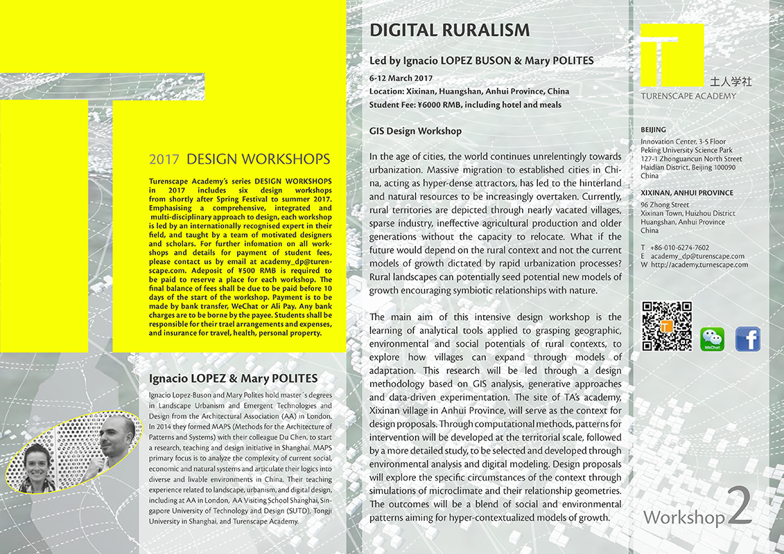 Turenscape Academy (TA) was established in 2015 with the exploration of environmental, social and cultural sustainability at the core of its beliefs and activities. Initiated and championed by Dr. Kongjian Yu, Member of The American Academy of Arts and Sciences, and the founder and Dean of College of Architecture and Landscape Architecture of Peking University, and the founder of Turenscape – a leading multidisciplinary design practice, the Academy pursues the concept of continuous lifelong learning. TA creates an immersive educational environment for Chinese and International graduate level students, recent graduates and mid-career professionals. Its residential campus is located in Xixinan, a heritage village situated nearby to Huangshan City and the beautiful Huangshan Mountains (Yellow Mountains), in Anhui province. A series of workshops will launch the academic life of Turenscape Academy (TA) during its first year. These workshops are aimed to lead towards the 4 academic tracks of TA: Architecture, Landscape Architecture, Urbanism, Art & Design.